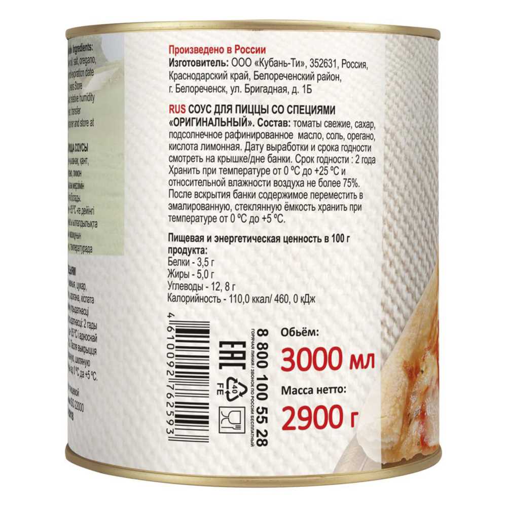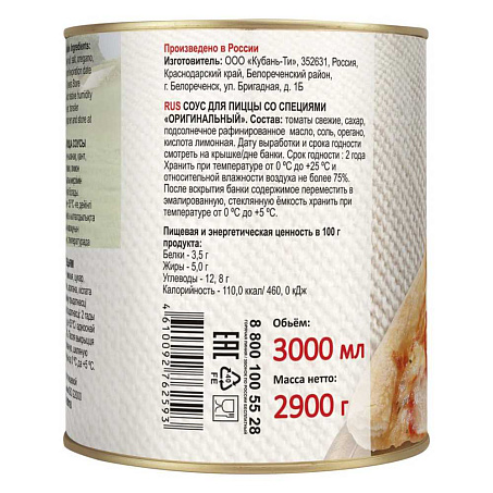 Соус для пиццы томатный со специями Оригинальный 2,9кг/3л ж/б Кубань Продукт™ Кубань-Ти (КОД 63788) (+18°С)