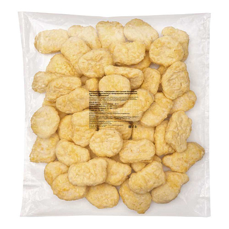 филе цыплят-бройлеров, вода, пшеничная мука, кукурузная мука, пшеничный крахмал, соль, разрыхлители: Е450, Е500; декстроза, подсолнечное масло, кожа цыплят-бройлеров, картофельный крахмал, манная крупа, пшеничная клейковина, черный перец, ароматизатор.