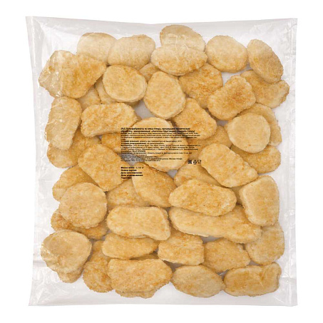 Фарш крупной рубки, приближённый к цельно-мышечным кускам, сфор-мованный в виде неровных кусочков стрипс, поверхность которых по-крыта сухарными крошками контрастного цвета. Продукт имеет види-мые включения черного перца и насечки в виде полос.