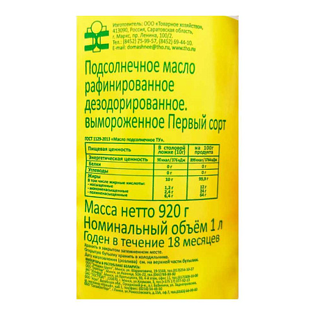 Масло подсолнечное рафинированное 1л пл/бут вымороженное 1сорт ГОСТ Товарное хозяйство (КОД 70859) (+18°С)