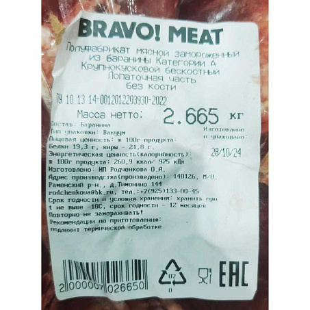 Баранина Лопатка б/к ~1,5кг х2 в/у кат А Bravo meat™ ИП Родченкова Россия (КОД 70888) (-18°С)