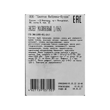 мука пшеничная, меланж, смесь для заварного крема (сахар, альгинат натрия. крахмал, молоко сухое цельное), сливки пастеризованные, смесь растительно-сливочная (масло сливочное, масла раст. (подсолнечное, пальмовое, оливковое)), малина замороженная, сахар, желатин, ароматизатор, идентичный натуральному «ванилин», краситель пищевой.