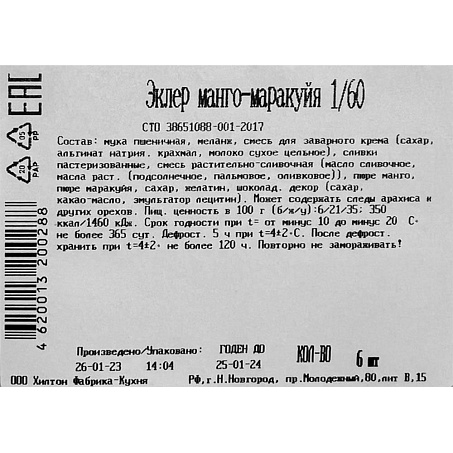 мука пшеничная, меланж, смесь для заварного крема (сахар, альгинат натрия. крахмал, молоко сухое цельное), сливки пастеризованные, смесь растительно-сливочная (масло сливочное, масла раст. (подсолнечное, пальмовое, оливковое)), пюре манго, пюре маракуйя, сахар, желатин, шоколад. декор (сахар, какао-масло, эмульгатор лецитин). Может содержать следы арахиса и других орехов.