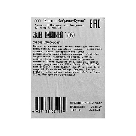 Эклер ванильный 60гр х6шт/уп х2/кор Бенье Хилтон Фабрика-кухня Россия (66) (КОР) (КОД 72672) (-18°С)