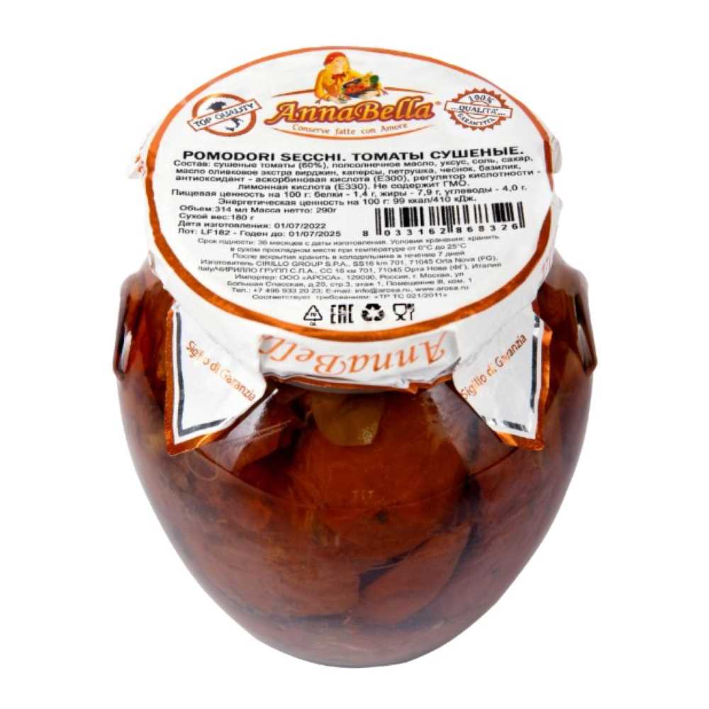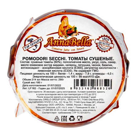 Томаты сушеные в масле 290гр/314мл (осн.пр.180гр) ст/б AnnaBella™ Италия (КОД 73396) (+18°С)