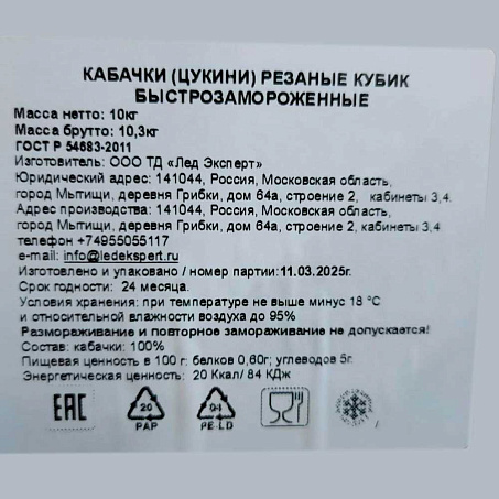 Кабачки (цукини) резанные кубик с/м 10кг Россия (ПУ) (КОД 73662) (-18°С)