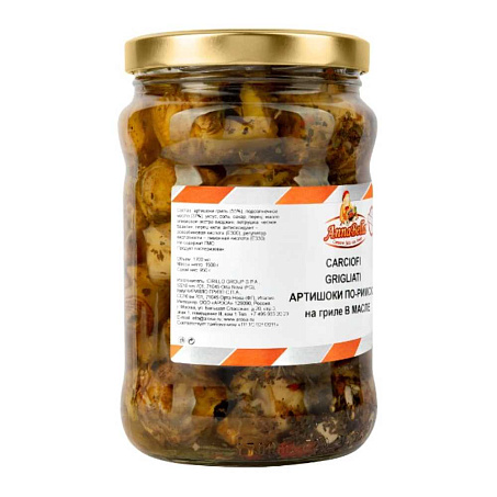 Артишоки целые (55%), подсолнечное масло (37%), уксус, соль, сахар, перец, масло оливковое ЭВ, петрушка, чеснок, базилик, чили, антиоксидант – аскорби