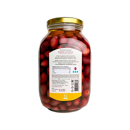 оливки соленые (оливки сорта Каламата с косточкой, вода питьевая, соль пищевая), вода питьевая, масло оливковое нерафинированное (Extra Virgin Olive Oil)