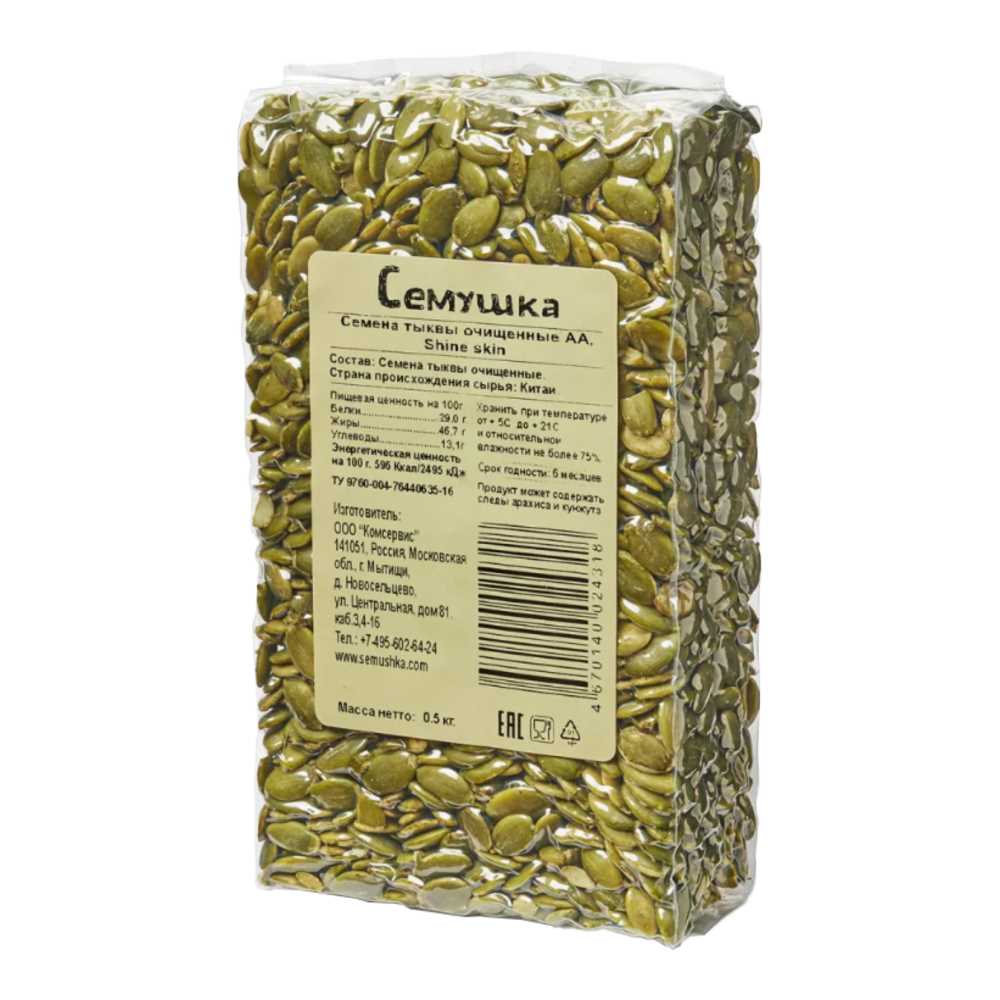 Семечки тыквенные сушеные очищенные АА 500гр/пакет Семушка™ Комсервис Россия (КОД 74581) (+18°С)