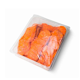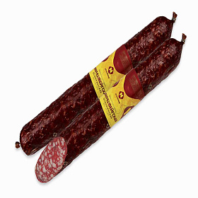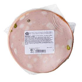 мясо птицы курица, свинина, шпик, белковый стабилизатор (шкура свиная, вода), растительный жир, стабилизатор E401, сыворотка сухая молочная, лактоза, стабилизаторы (Е450, E452, E333), загустители (Е417, E415), молоко сухое обезжиренное, смесь посолочно-нитритная (соль пищевая, фиксатор окраски нитрит натрия), стабилизатор (Е1412), глюкоза, усилитель вкуса и аромата (глутамат натрия), антиокислители (аскорбиновая кислота, аскорбат натрия), перец черный,чеснок, экстракты специй (муската, чили, можжевельника, кориандра), ароматизатор, идентичный натуральному Ваниль, гемоглобин сухой, краситель (кармины).