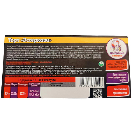 Молоко 2,5% (нормализированное коровье молоко ), сахар-песок, масло сливочное 72,5% (пастеризованные сливки из коровьего молоко), мука миндальная, миндаль цельный, ядро миндаля резаное (лепестками), полуфабрикат кондитерский пастообразный ( сахар, жиры и масла растительные, сыворотка сухая молочная, молоко сухое обезжиренное, эмульгатор (лецитин соевый Е 322), ароматизаторы ( «Ванилин» ,» Концентрированное молоко»)), глазурь кондитерская белая (сахар, заменитель масла какао лауринового типа, сыворотка молочная сухая, мальтодекстрин, эмульгаторы, соль, краситель Е171,ароматизатор «Ваниль»), крахмал картофельный, крем сливочный «сливки для взбивания» ультропастеризованные (нормализованные сливки, стабилизаторы: моно- и диглицириды жирных кислот, каррагинан), мука пшеничная общего назначения, яйцо куриное, глазурь шоколадная (сахар, заменитель какао-масла нетемперированный лауринового типа, ароматизатор “Ванилин”), соль, лимонная кислота, корица.