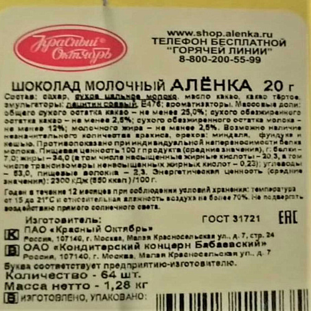 Шоколад молочный 25% плитка Аленка 20гр х 256шт/кор ГОСТ Красный октябрь (КО16060) (КОР) (КОД 39015)(+18°С)