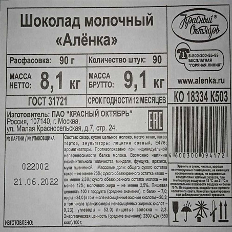 Шоколад молочный 25% плитка Аленка 60гр х25шт/упак ГОСТ Красный октябрь (КО20052) (КОД 39016)(+18°С)