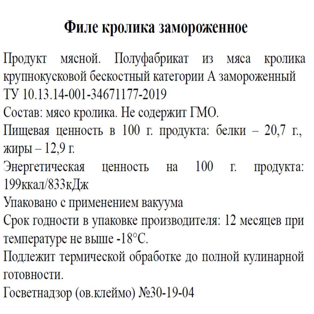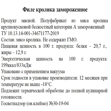 Детальное описание: В каждой упаковке расположено бескостное мясо (филе) от двух безногих тушек кролика