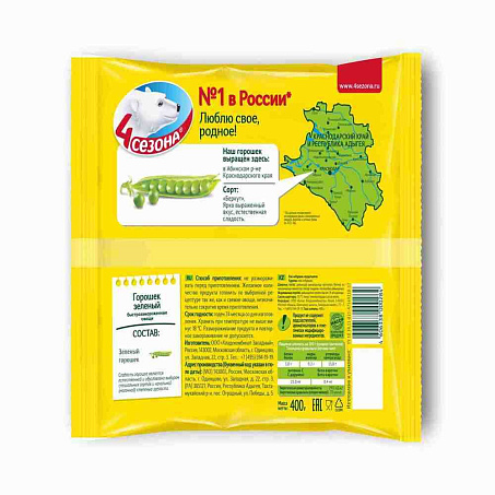Горошек зеленый с/м 400гр/пакет 4 Сезона ™ ХК Западный Россия (КОД 39419) (-18°С)