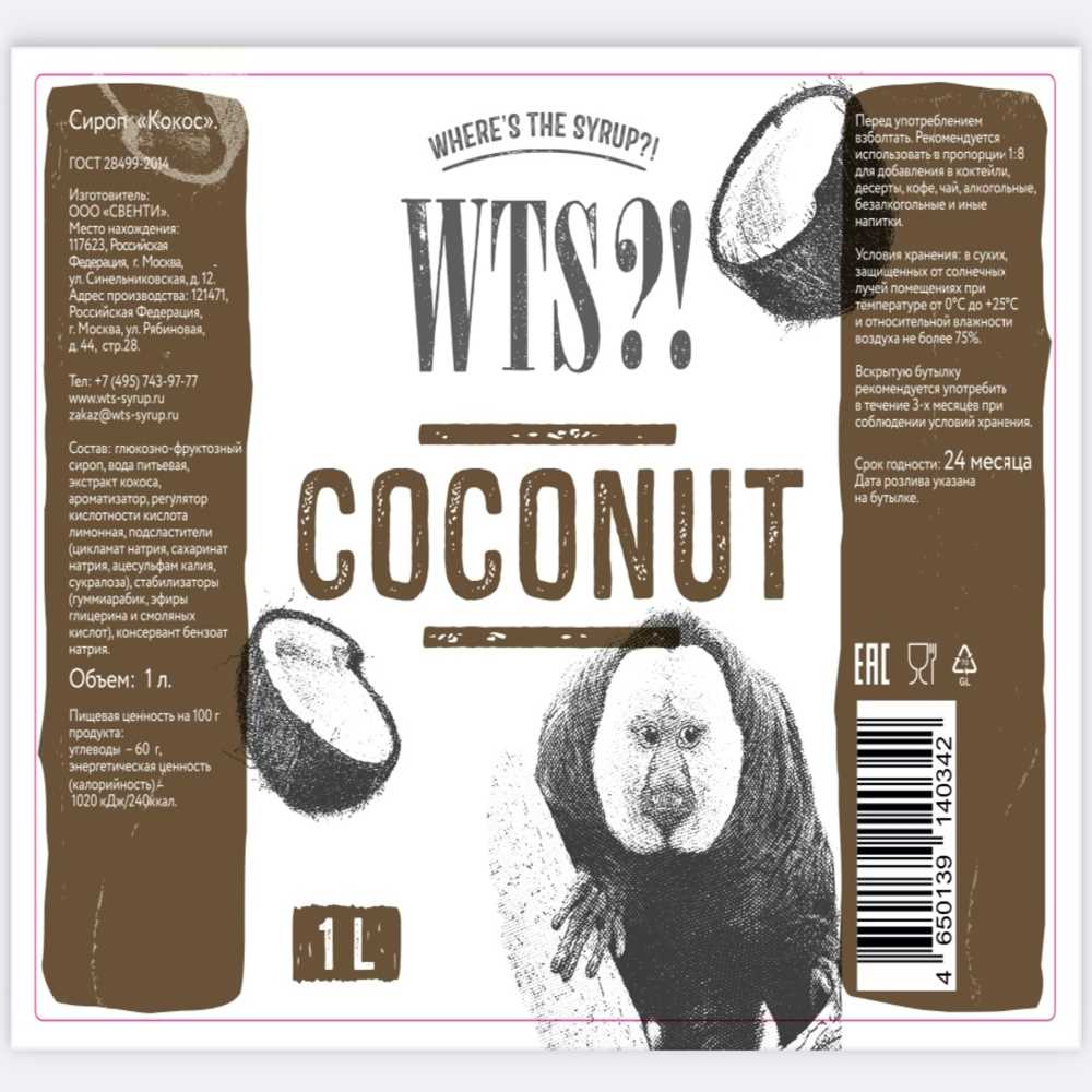Сироп Кокос 1л ст/бут WTS?™ Свенти Россия (КОД 39546) (+18°С)