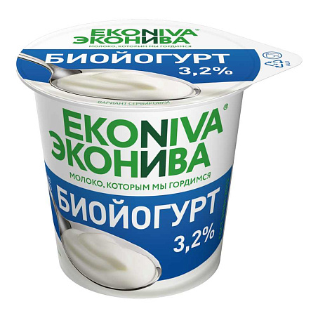 "Биойогурт ЭКОНИВА 3,2% – это вкусный и полезный кисломолочный продукт, изготовленный из молока высшего сорта и специальной заквасочной культуры с использованием термофильного стрептококка, болгарской палочки, а также бифидобактерий Bifidobacterium longum и Bifidobacterium bifidum. Такой продукт разнообразит пищевой рацион людей, которые стремятся вести здоровый образ жизни. Биойогурт ЭКОНИВА станет отличным ингредиентом для создания десертов с гранолой, злаками, орехами и топпингами.