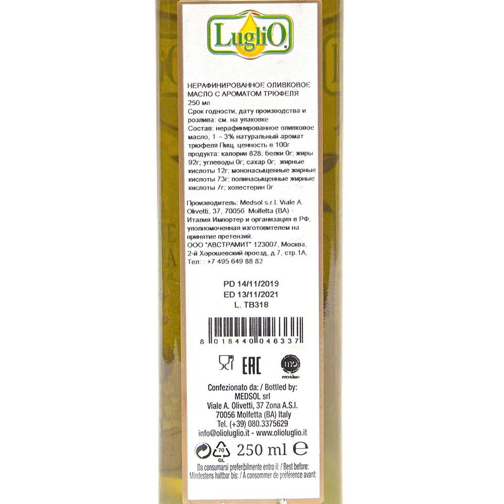Детальное описание: Нерафинированное оливковое масло с ароматом трюфеля.