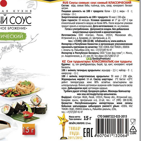 Соус соевый классический порц. сашет 15грх300шт/кор Sen Soy™ Россия (КОР) (КОД 98238) (+18°С)