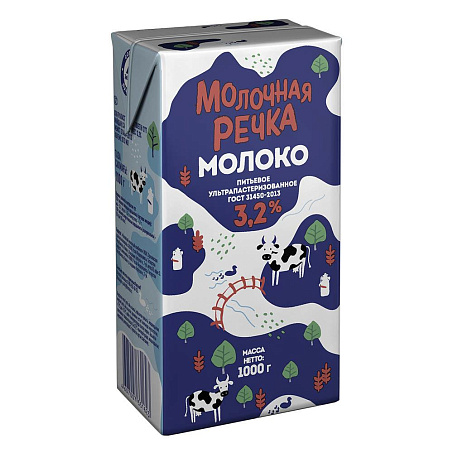 Молоко 3,2% 973мл (1кг) tetra-pak Молочная речка™ ГОСТ БЗМЖ UHT Милком Россия (ПУ) (КОД 12298) (0°С)