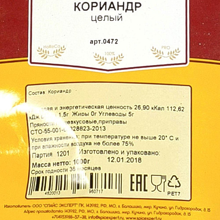 Кориандр (кинза) целый 1кг/пакет Спайс Эксперт Россия (КОД 72013) (+18°С)