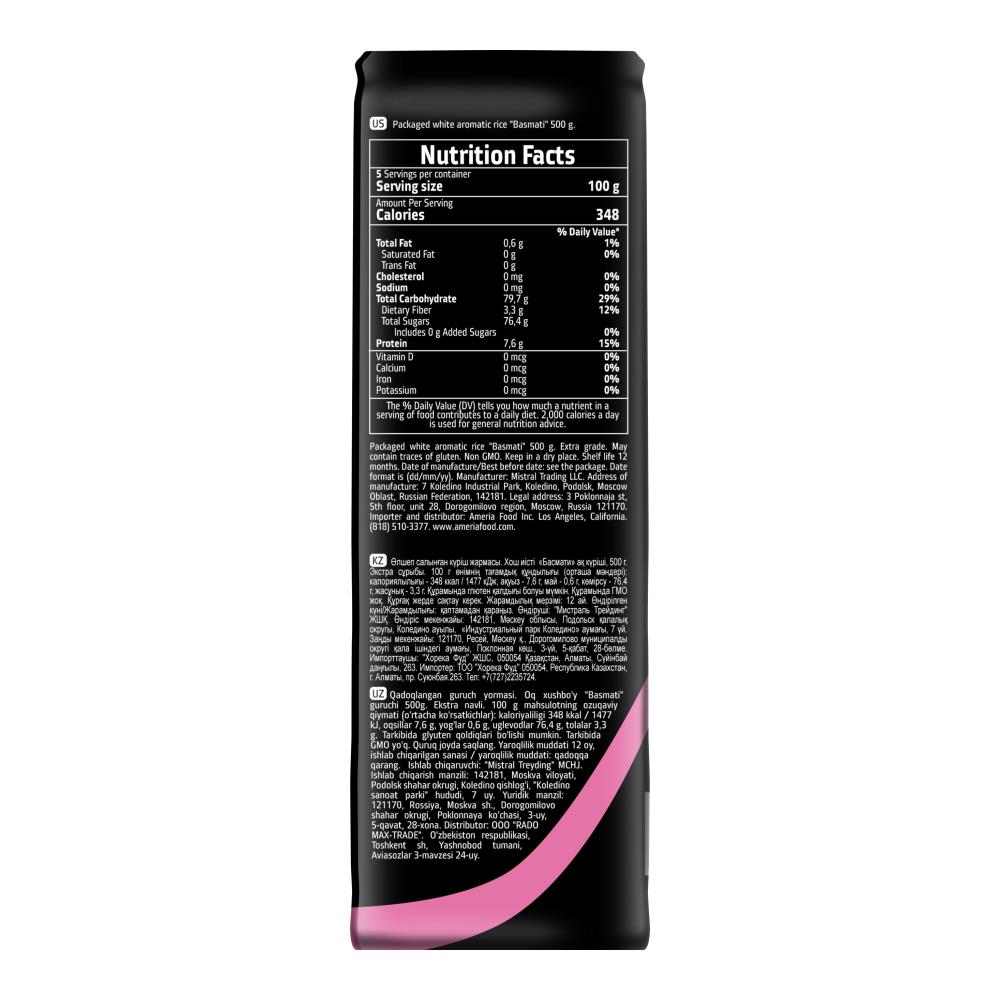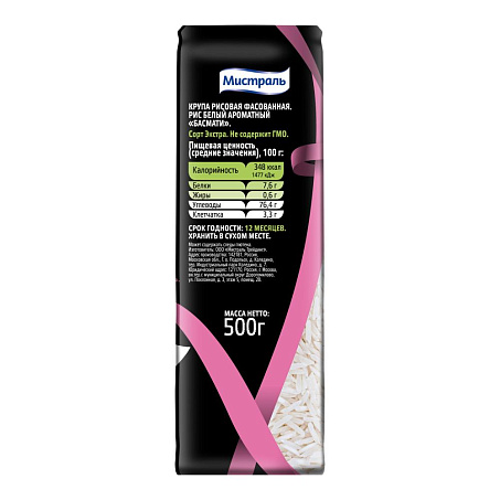 Рис Басмати белый ароматный длиннозерн 500гр/пакет Мистраль Россия (КОД 97455) (+18°С)