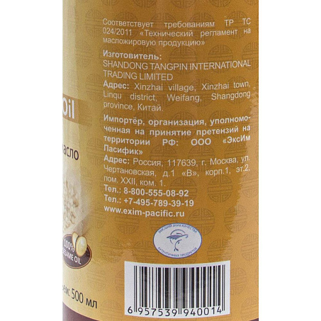 100% кунжутное масло первого горячего отжима темное нерафинированное (получено путем прессования).