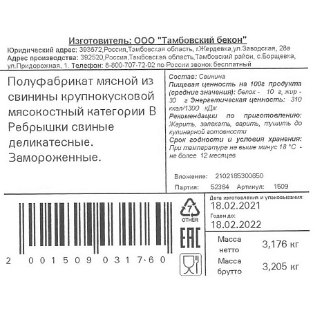 полуфабрикат мясной из свинины крупнокусковой мясокостный категории В Ребрышки свиные деликатесные. Замороженные