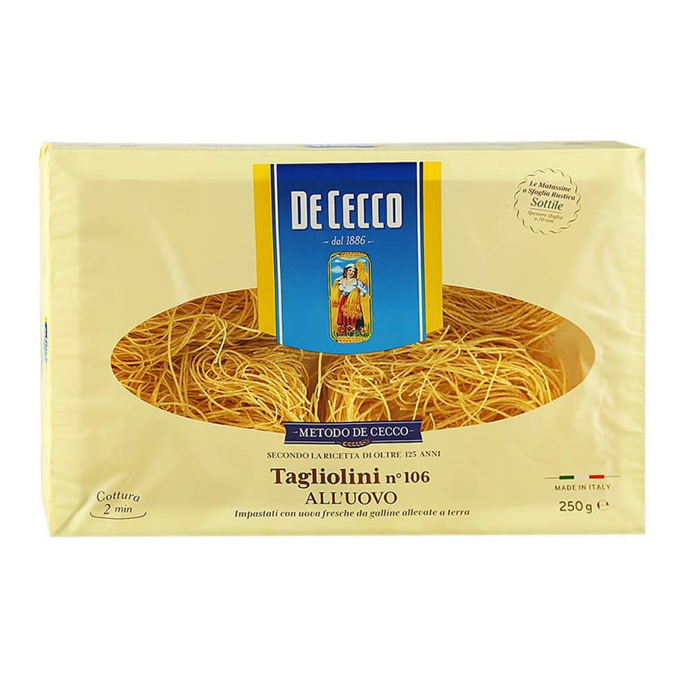 Для приготовления яичной пасты De Cecco используются исключительно натуральные свежие яйца (около 3-х дней после снесения), охлажденные до температуры 2-3 ° С. Тальолини принадлежат семейству длинных макаронных изделий, плоских или полу плоских в сечении, толщиной 0,55 мм и шириной 1,15 мм. Географическое происхождение этого формата спорно между Генуя, зоны Неаполя и Чочарии. По крестьянской традиции Абруццо, Тальолини подавали в бульоне из курицы или голубя «новоиспеченным» мамам, как тонизирующее и легкое блюдо. Тальолини отличны в супах с мясом разного вида и овощей. в рецептах на легкой томатной основе, на основе сливочного масла или мягких сыров. В Неаполе они являются первым ингредиентом для приготовления традиционных рецептов в духовке и макаронных запеканок.