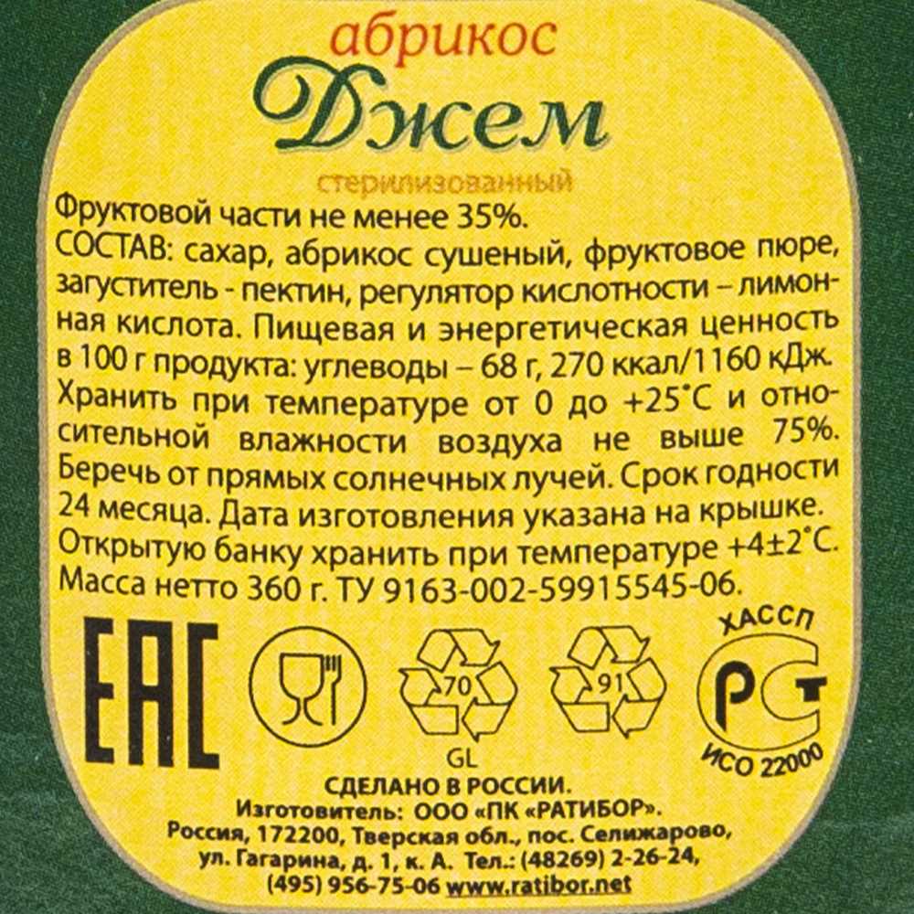 Детальное описание: Джем абрикос стерилизованный. Фруктовой части не менее 35%. Открытую банку хранить при температуре +4±2°С.
