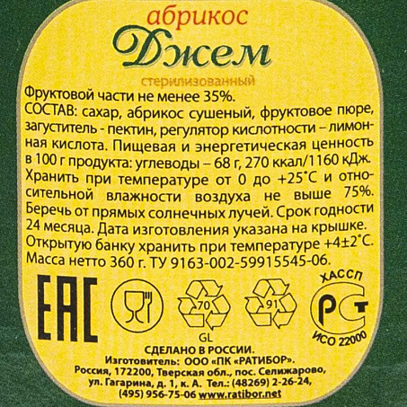Джем абрикос более 35% фрукт 360гр ст/б Ратибор Россия (15434426) (КОД 77247) (+18°С)