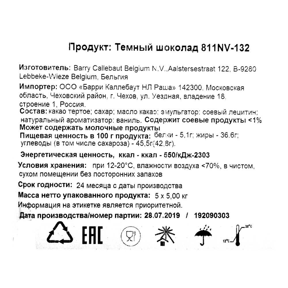 Шоколад темный 54,5% блок 5кг/пакет Callebaut Бельгия (811NV-132) (КОД 12296) (+18°С)
