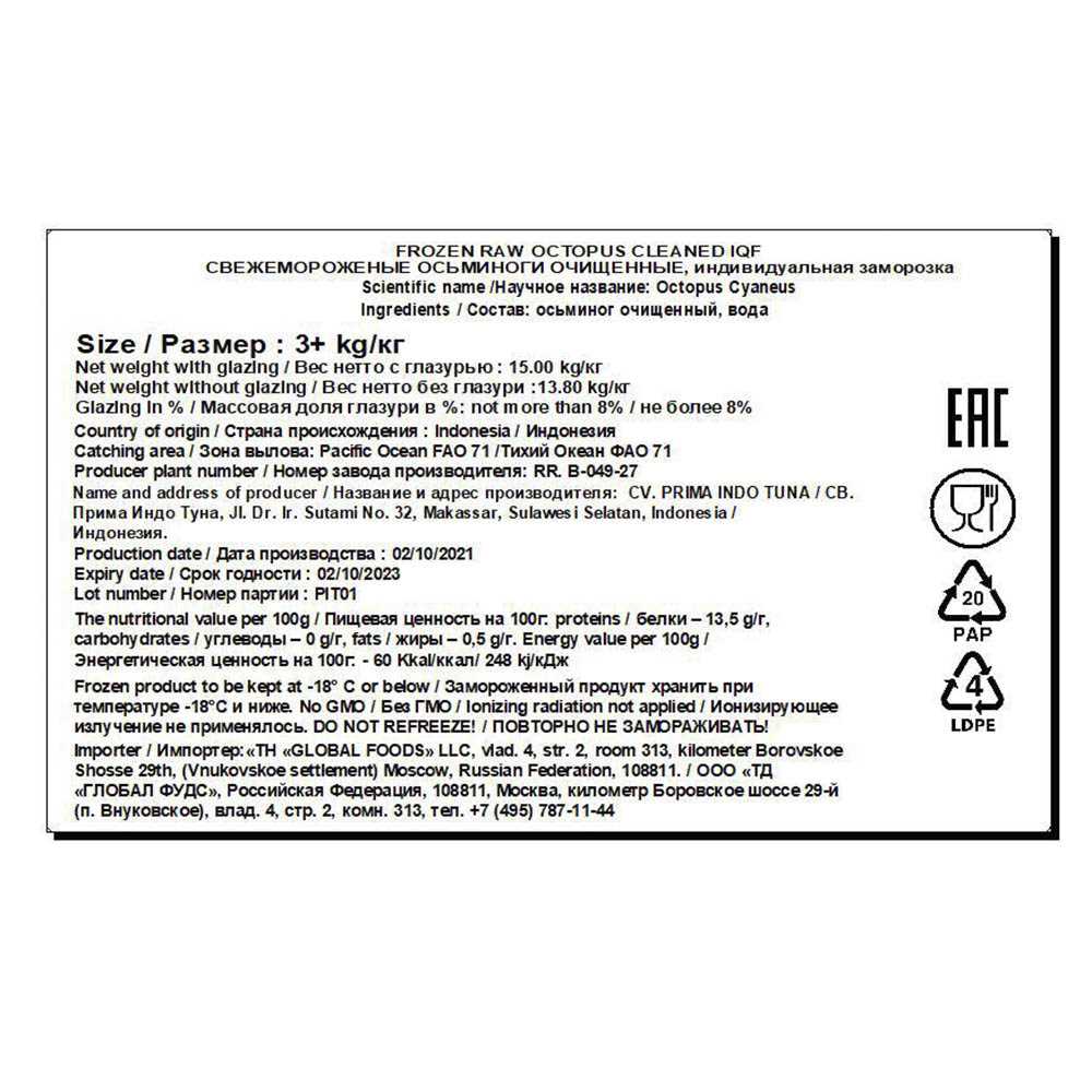 Осьминоги целые 3кг+ 15кг/кор 8%гл IQF Prima Indo Tuna RR.B-049-27 Индонезия (КОР) (КОД 20905) (-18°С)