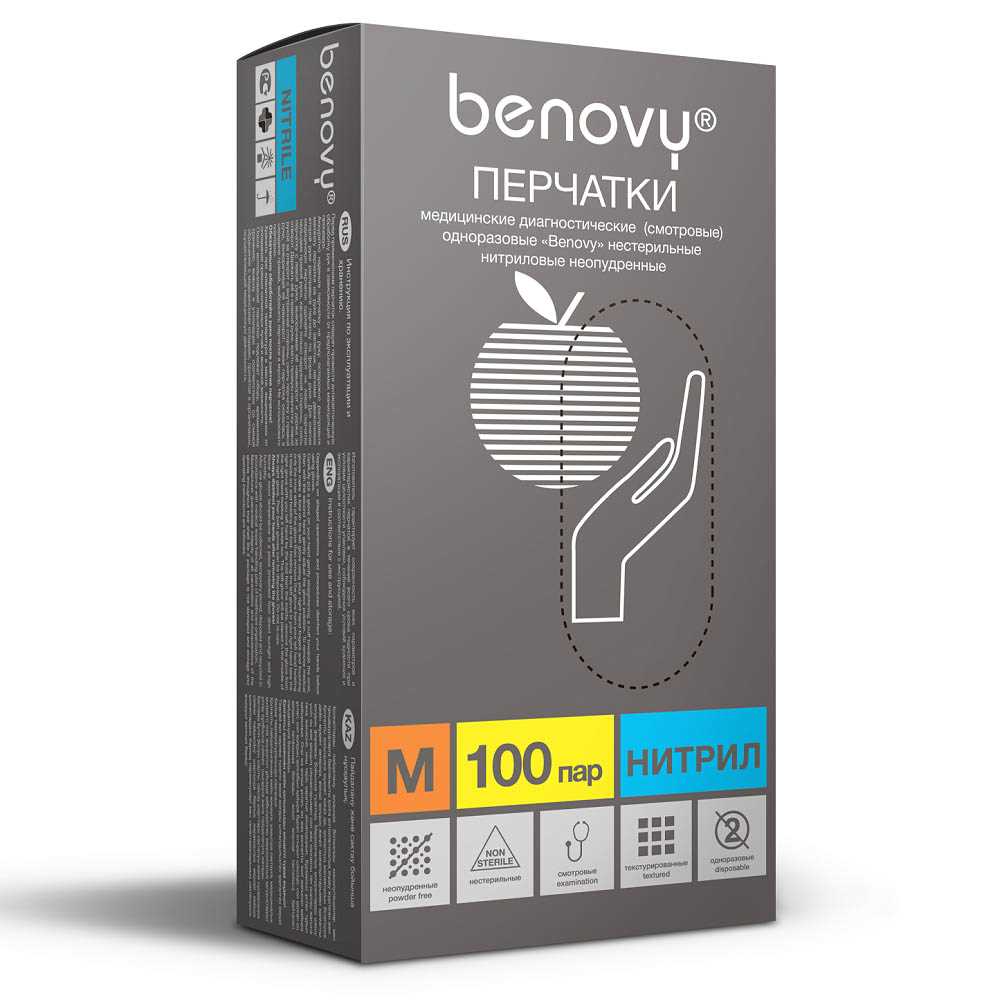Перчатки нитриловые смотровые, размер M, 200шт/уп (голубые) Benovy® Малайзия (КОД 99654) (+18°С)