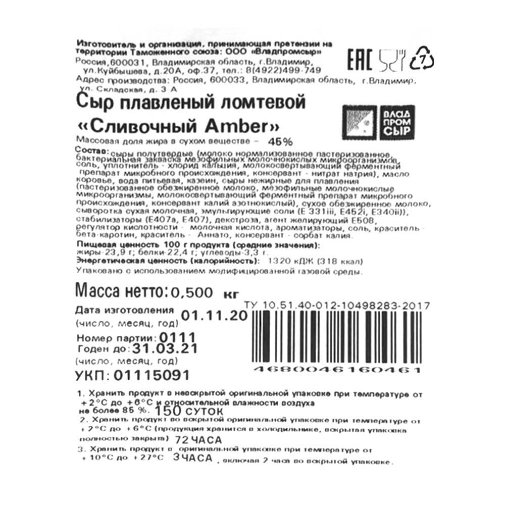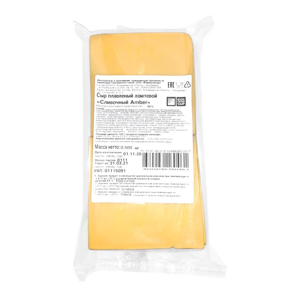 Сыр Amber оранж сливочн плавл нарезка 45% 40ломт 500гр флоу-пак МГС БЗМЖ Владпромсыр(КОД 37042)(0°С)