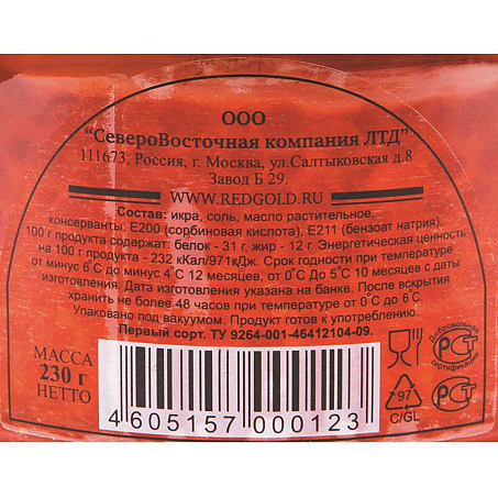 Икра Лососевая 230гр ст/б "Горбуша" зернистая 1 сорт "Красное золото" СВК ЛТД,Россия(КОД 40633) (-6/-1°С)