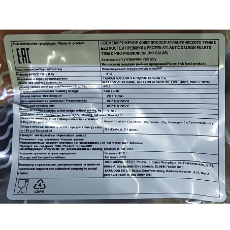 Семга филе с/м на коже 1,8-2,3кг (4-5) в/у 5%гл trim D Чили (ПУ) (КОД 41054) (-18°С)