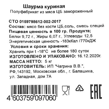 Шаурма из мяса курицы 40см Ø15см маринован 5кг/шт бабина Чагрина (КОД 44915) (-18°С)
