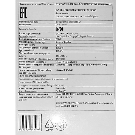 Креветки тигровые черные с/г в панцире 16/20 (кг) 1кг полу-IQF 14%гл Бангладеш (ПУ) (КОД 46317)(-18°С)