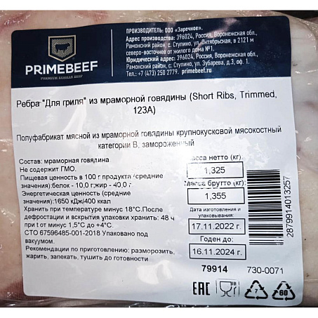Данный продукт получают из короткорезанного реберного отруба (3 ребра), разделенного на две части. Спинная сторона должна быть срезана под прямым углом от ребер (back ribs) и спинного отруба , срез должен быть ровным по всей поверхности. Брюшная сторона ребер (ближе к грудному отрубу) должна быть прямой, и распиленной примерно параллельно к спинной стороне и не должна содержать каких-либо реберных хрящей. Естественное утолщение жира в мышце (на поверхности продукта) не нормируется и подлежит измерению арочным методом: когда между соседними мышцами есть жировые прослойки, то жир измеряется над этими мышцами и составляет не более 10 мм. Толщина межмышечного жира не регламентируется.