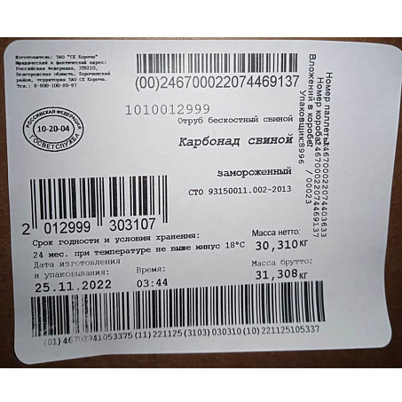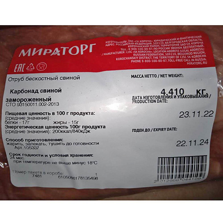 Свинина корейка б/к (карбонад) ~2-4кг/пакет Мираторг™ Россия (ПУ) (КОД 48891) (-18°С)