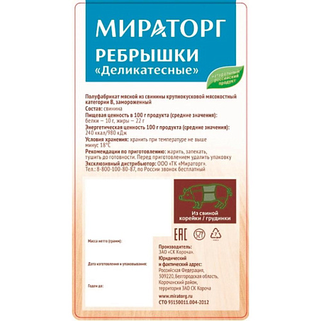 Одна мясокостная реберная пластинка с корейки (с прирезью мяса карбонада и шпика) с ребрами и межреберным мясом с естественным соотношением тканей в вакуумной упаковке.