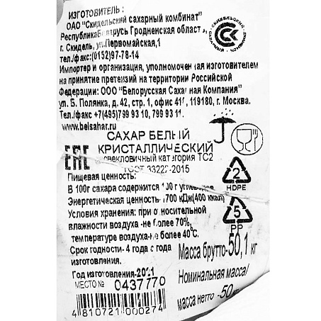Сахарный песок 50кг/меш СВ ТС2 ГОСТ Скидельский Сахарный комбинат Беларусь (КОД 50031) (+18°С)