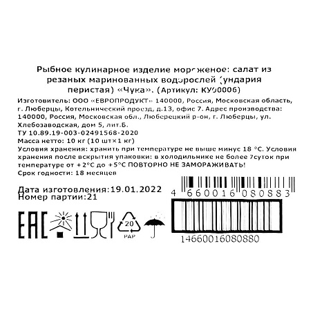 водоросли морские (ундария пористая), вода, сахар, грибы черные сушеные (аурикулярия густоволосистая), загуститель - агар пищевой, соль, уксус спиртовой, семена кунжута обжаренные, перец чили резаный сушеный, масло кунжутное неравинированное, загуститель - ксантановая камедь.