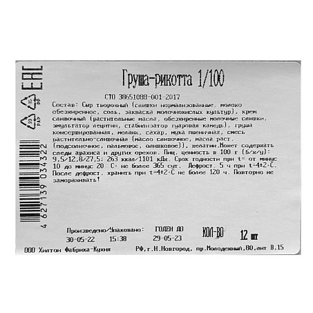 Сыр творожный (сливки нормализованные, молоко обезжиренное, соль, закваска молочнокислых культур), крем сливочный (растительные масла, обезжиренные молочные сливки, эмульгатор лецитин, стабилизатор гуаровая камедь), груша консервированная, меланж, сахар, мука пшеничная, смесь растительно-сливочная (масло сливочное, масла раст. (подсолнечное, пальмовое, оливковое)), желатин.Может содержать следы арахиса и других орехов.