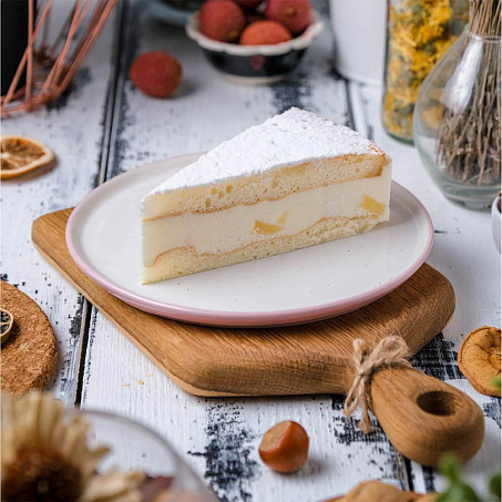 Детальное описание: Два слоя ванильного бисквита соединены нежным кремом из сыра рикотта с добавлением  кусочков груши