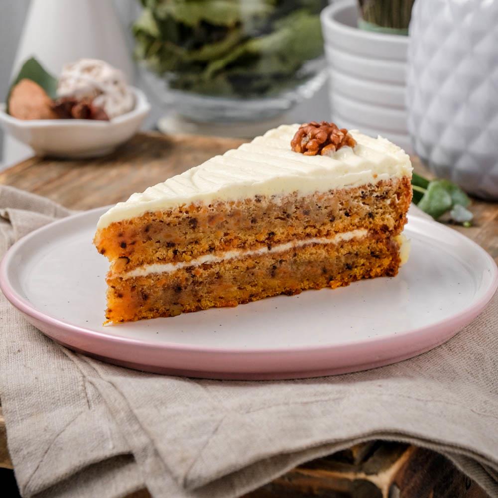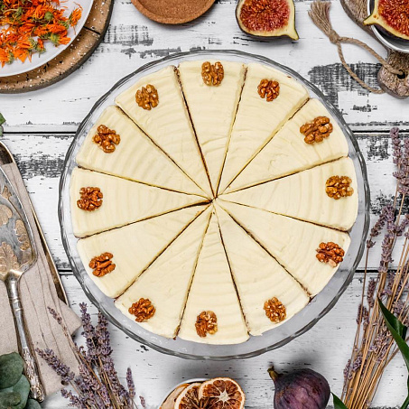 Пряные коржи с добавлением моркови и грецкого ореха, с прослойками крема из творожного сыра.