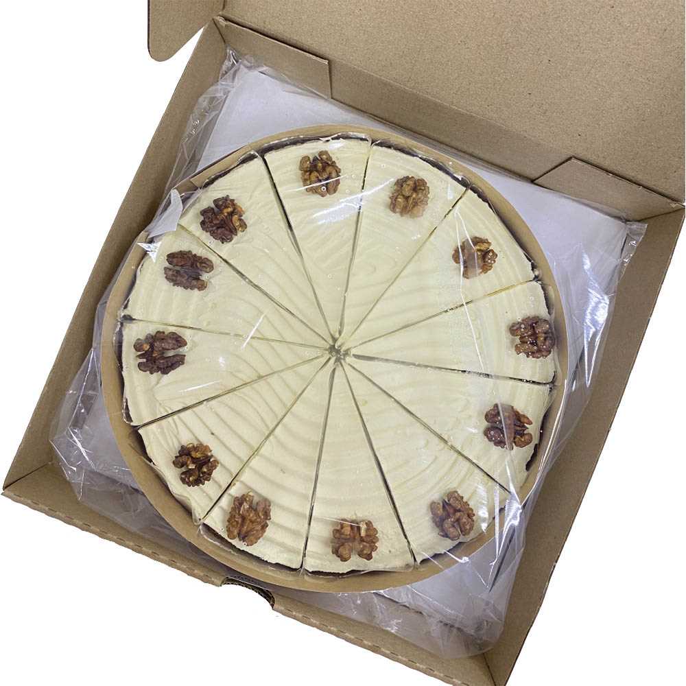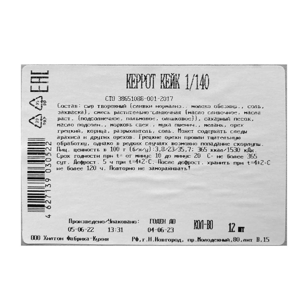 Сыр творожный (сливки нормализ., молоко обезжир., соль, закваска), смесь растительно-сливочная (масло сливочное, масла раст. (подсолнечное, пальмовое, оливковое)), сахарный песок, масло подсолн., морковь свеж., мука пшенич., меланж, орех грецкий, корица, разрыхлитель, соль. Может содержать следы арахиса и других орехов. Грецкие орехи прошли тщательную обработку, однако в редких случаях возможно попадание скорлупы.