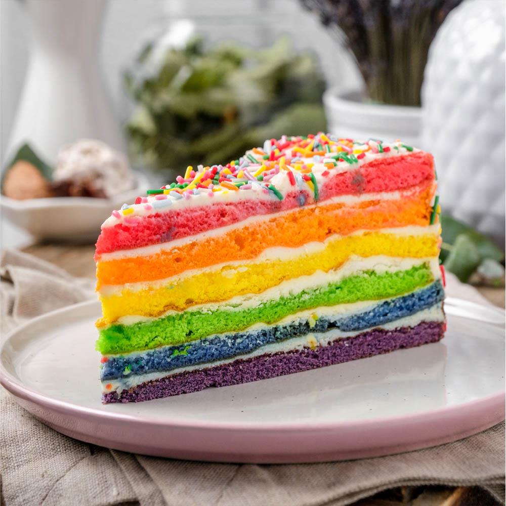 Легкий бисквитный торт из разноцветных коржей с добавлением творожного сыра.