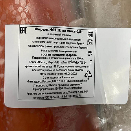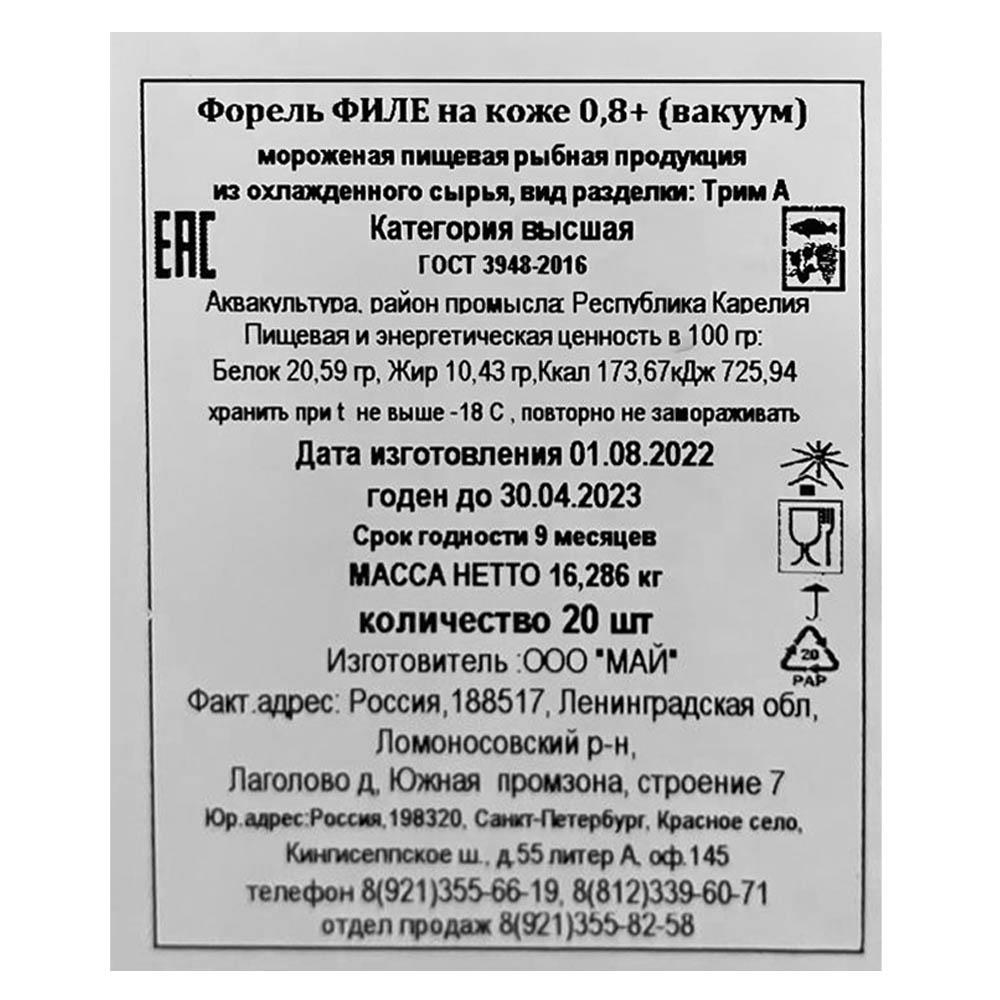 Форель филе с/м на коже ~800гр+ в/у trim А ГОСТ Май Россия (КОД 55855) (-18°С)